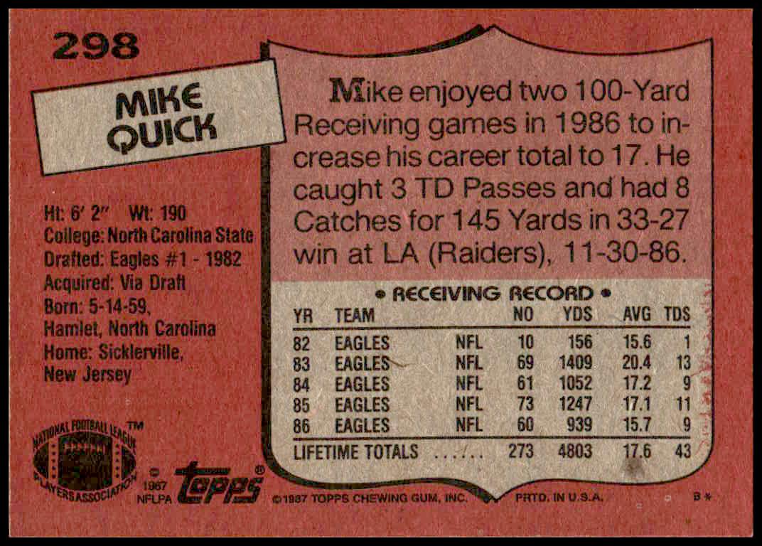 This Football card, from 1987 is part of the Topps  card set. Mike Quick is featured and has a card number of 298.