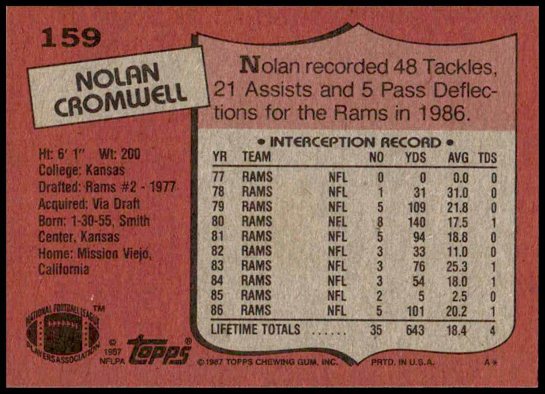 This Football card, from 1987 is part of the Topps  card set. Nolan Cromwell is featured and has a card number of 159.