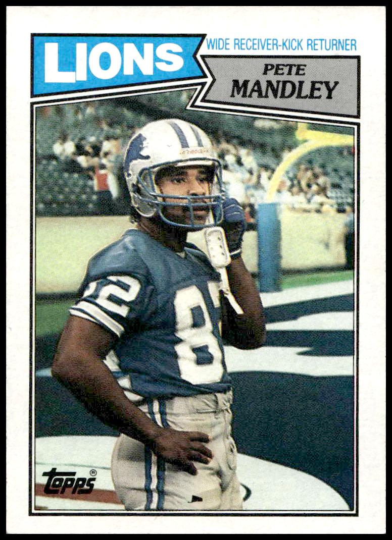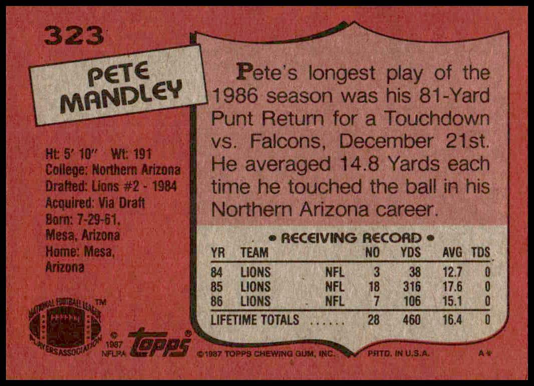 This Football card, from 1987 is part of the Topps  card set. Pete Mandley is featured and has a card number of 323.