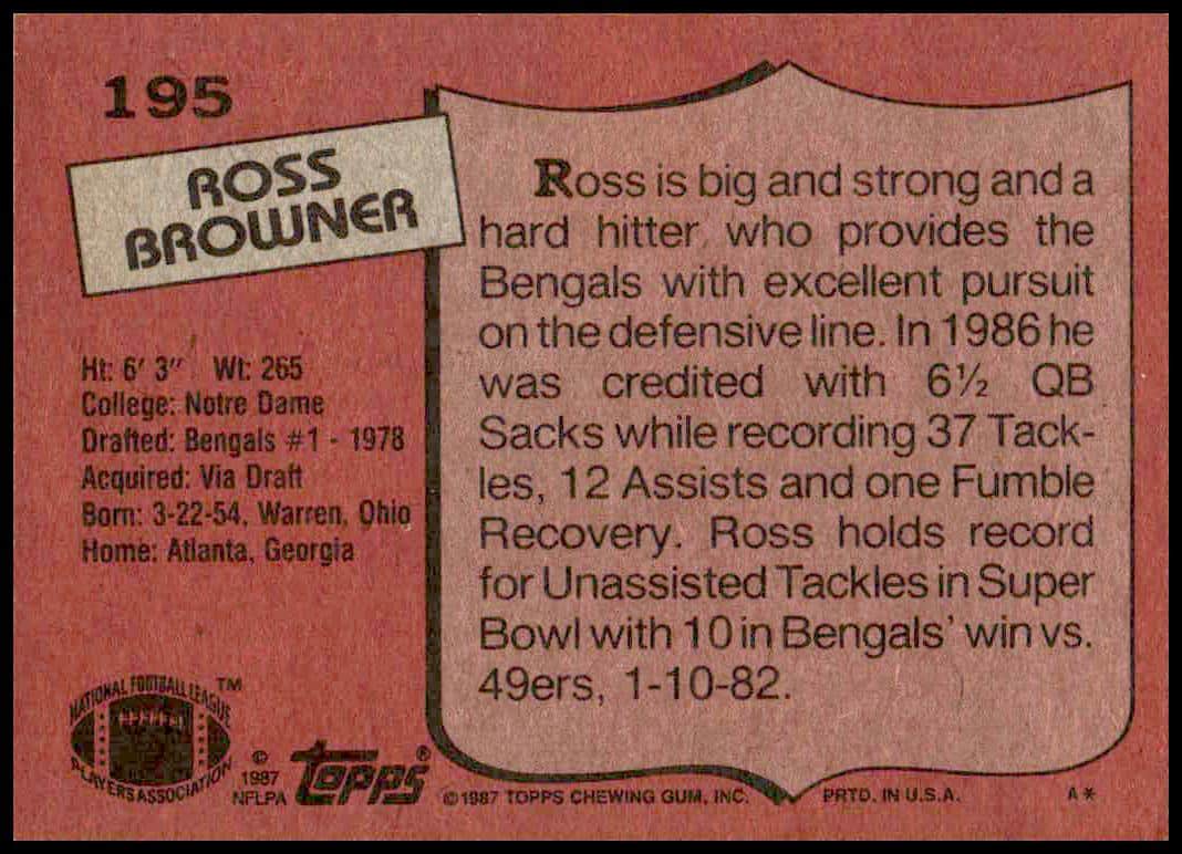 This Football card, from 1987 is part of the Topps  card set. Ross Browner is featured and has a card number of 195.