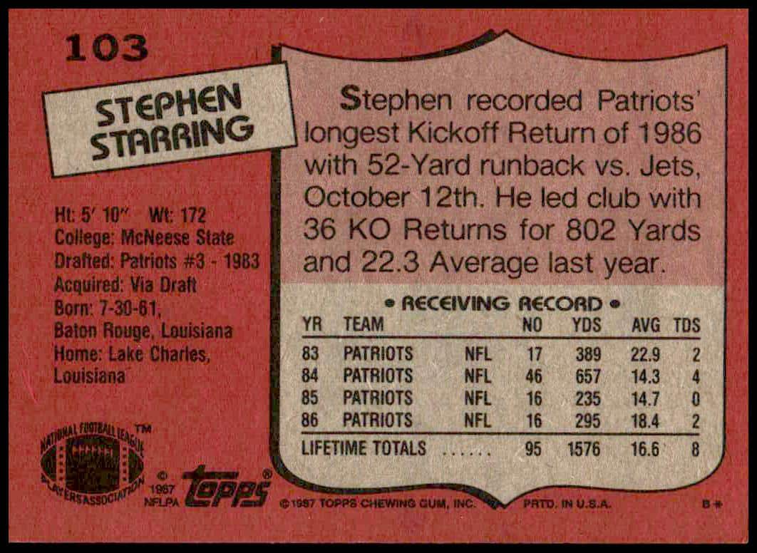 This Football card, from 1987 is part of the Topps  card set. Stephen Starring is featured and has a card number of 103.