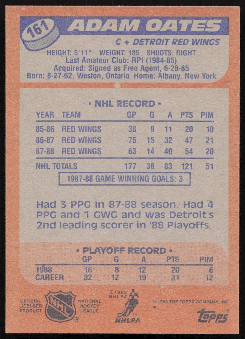 This Hockey card, from 1988-89 is part of the Topps card set. Adam Oates is featured and has a card number of 161.