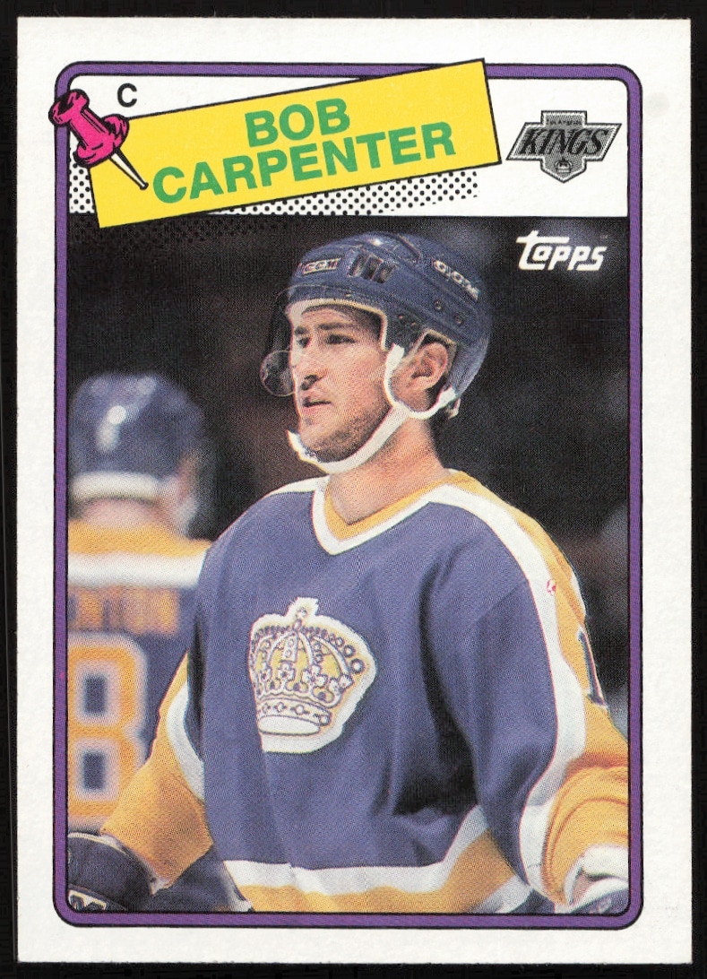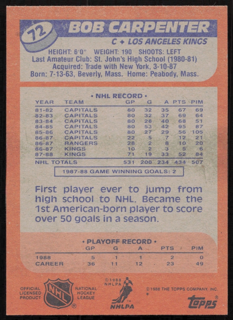 This Hockey card, from 1988-89 is part of the Topps card set. Bob Carpenter is featured and has a card number of 72.