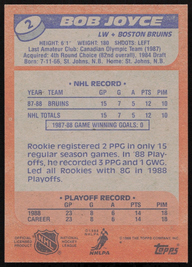 This Hockey card, from 1988-89 is part of the Topps card set. Bob Joyce is featured and has a card number of 2.