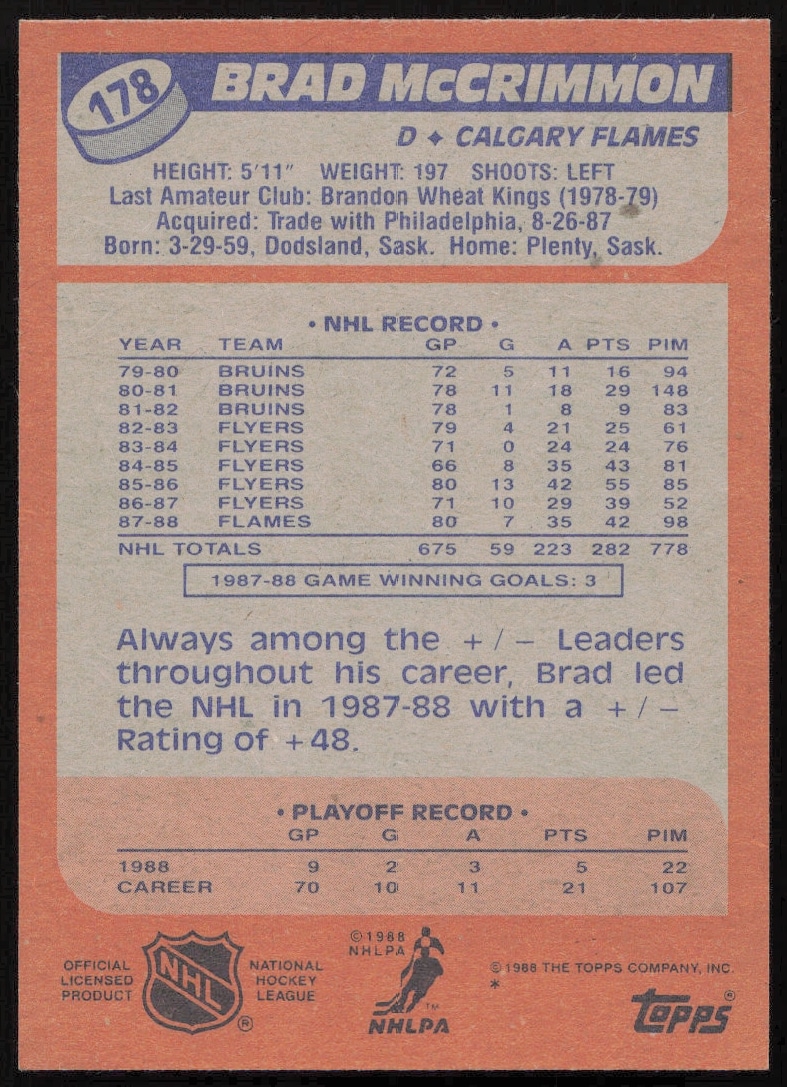 This Hockey card, from 1988-89 is part of the Topps card set. Brad McCrimmon is featured and has a card number of 178.