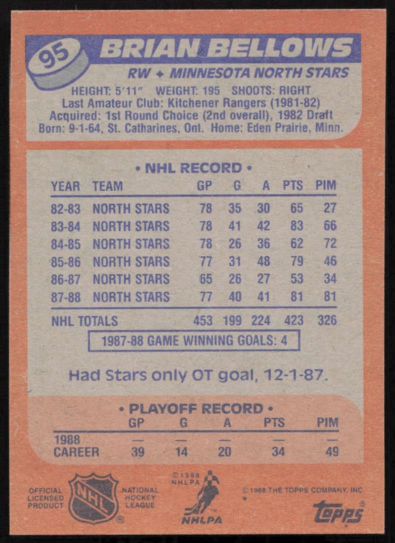 This Hockey card, from 1988-89 is part of the Topps card set. Brian Bellows is featured and has a card number of 95.