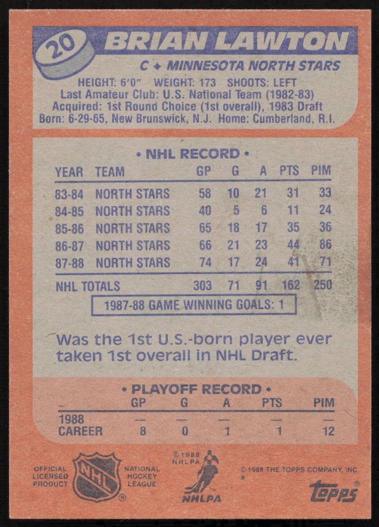 This Hockey card, from 1988-89 is part of the Topps card set. Brian Lawton is featured and has a card number of 20.