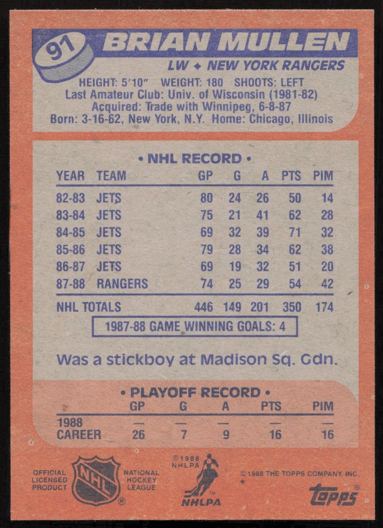 This Hockey card, from 1988-89 is part of the Topps card set. Brian Mullen is featured and has a card number of 91.