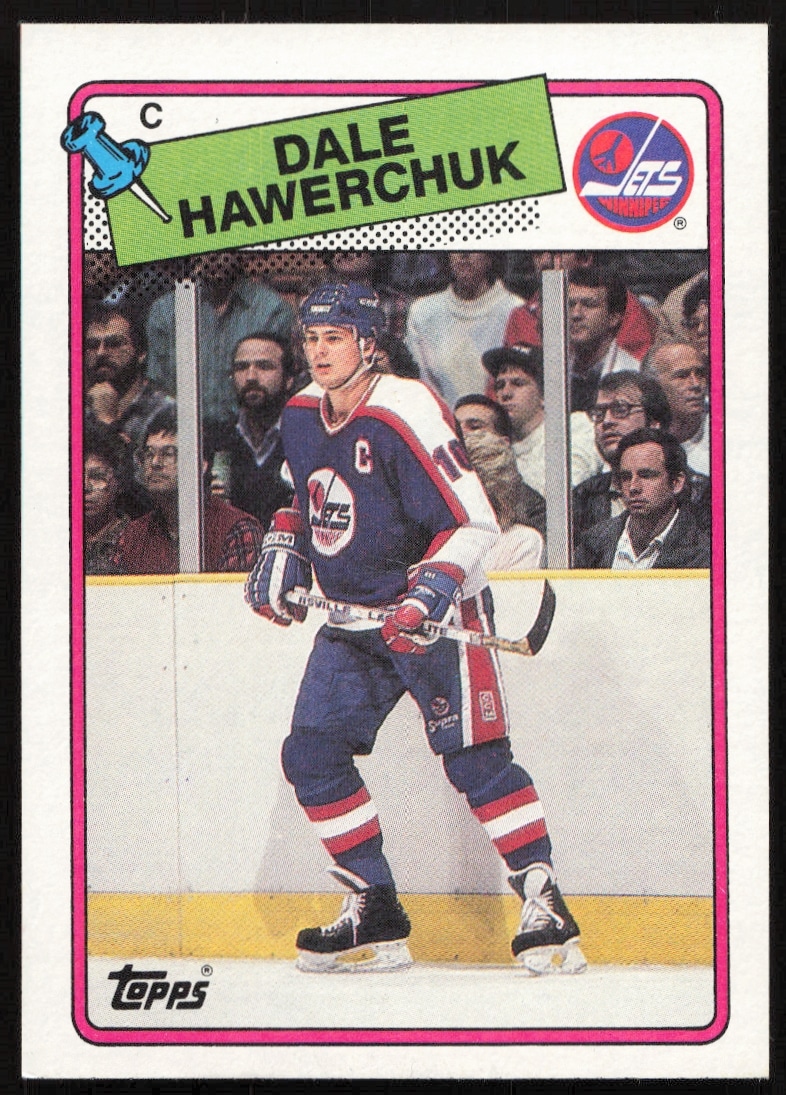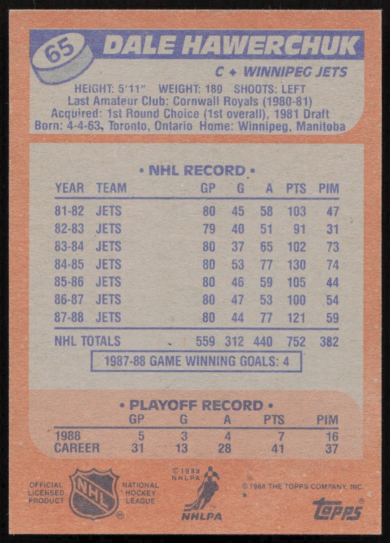 This Hockey card, from 1988-89 is part of the Topps card set. Dale Hawerchuk is featured and has a card number of 65.