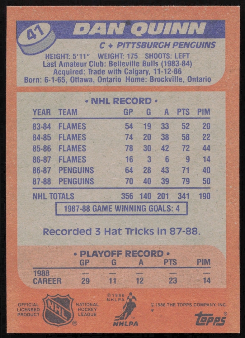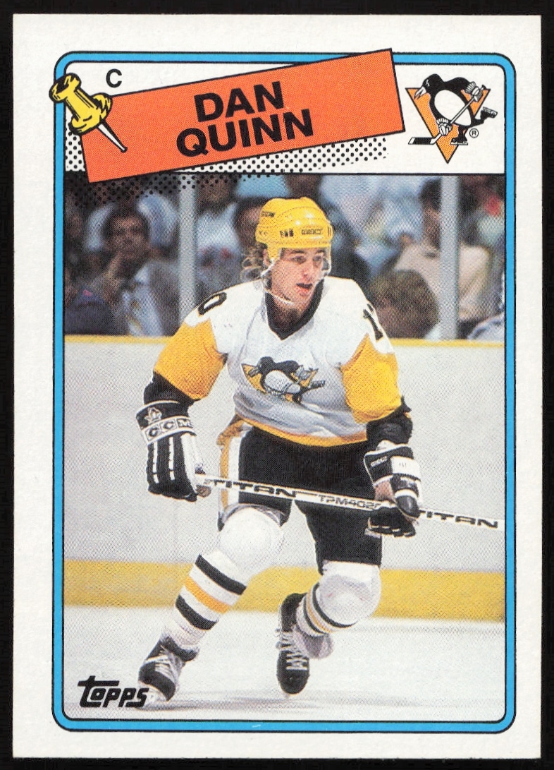 This Hockey card, from 1988-89 is part of the Topps card set. Dan Quinn is featured and has a card number of 41.