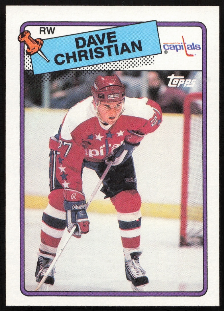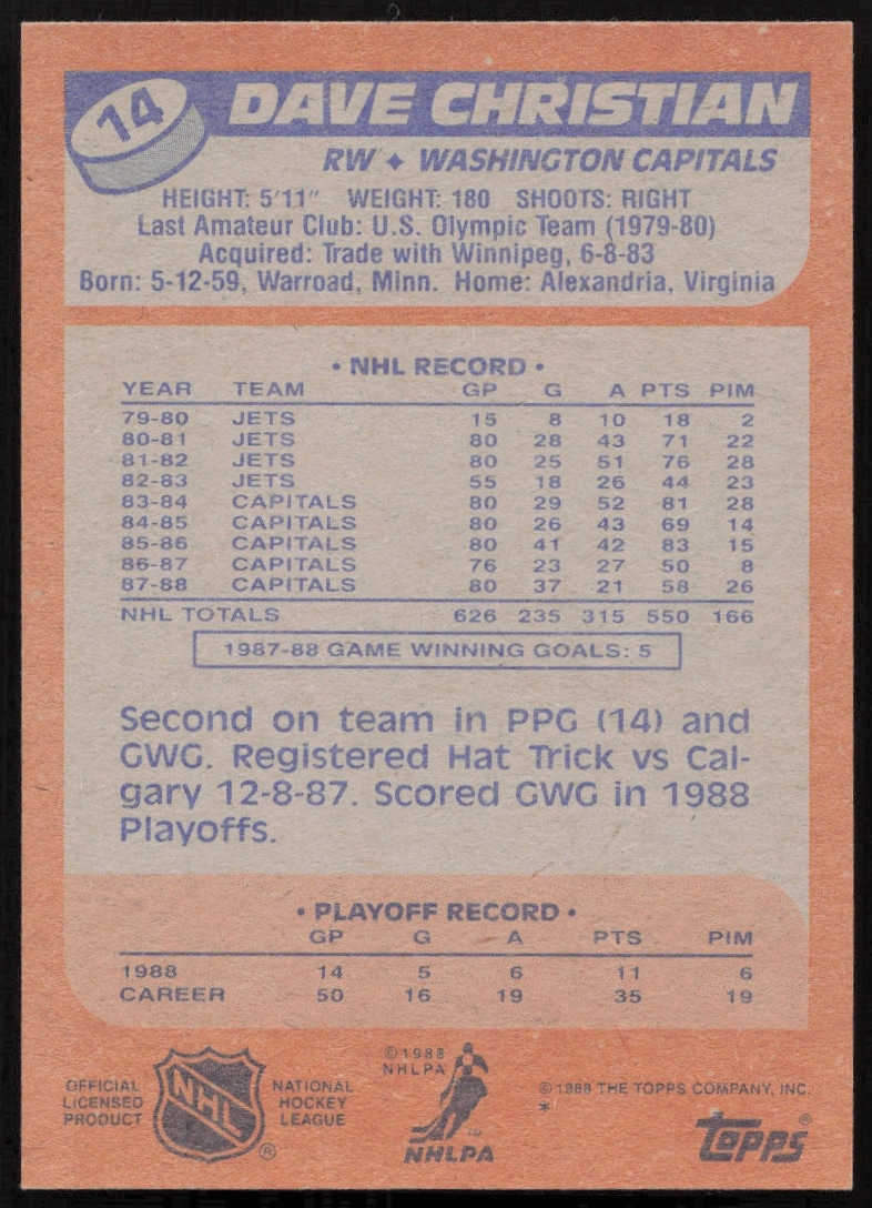 This Hockey card, from 1988-89 is part of the Topps card set. Dave Christian is featured and has a card number of 14.