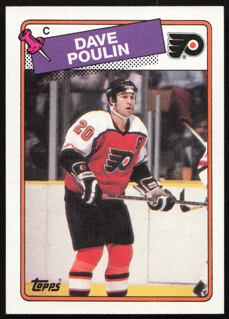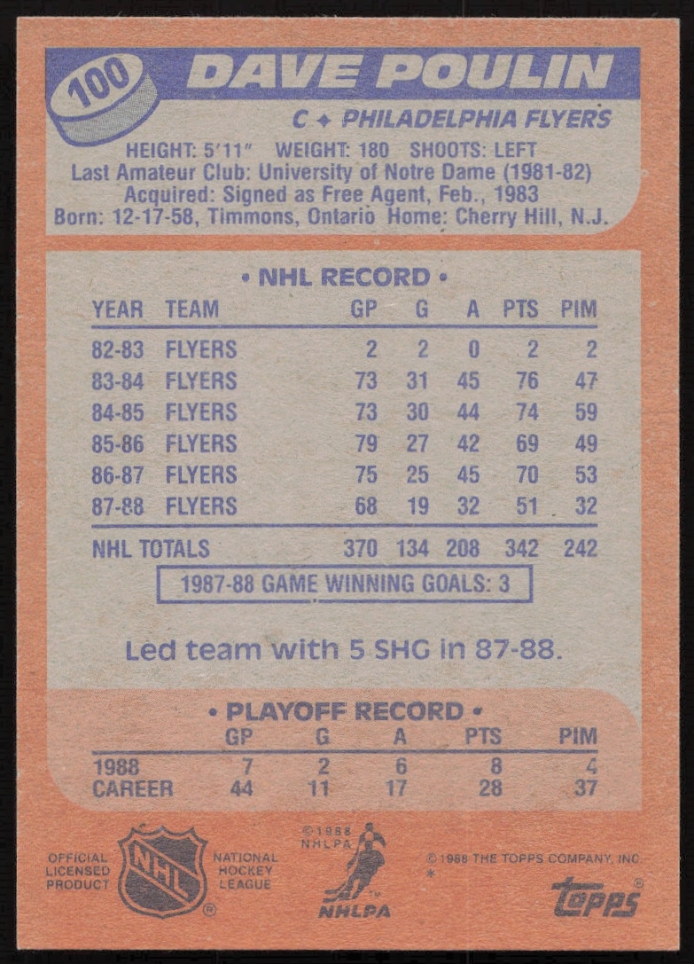 This Hockey card, from 1988-89 is part of the Topps card set. Dave Poulin is featured and has a card number of 100.
