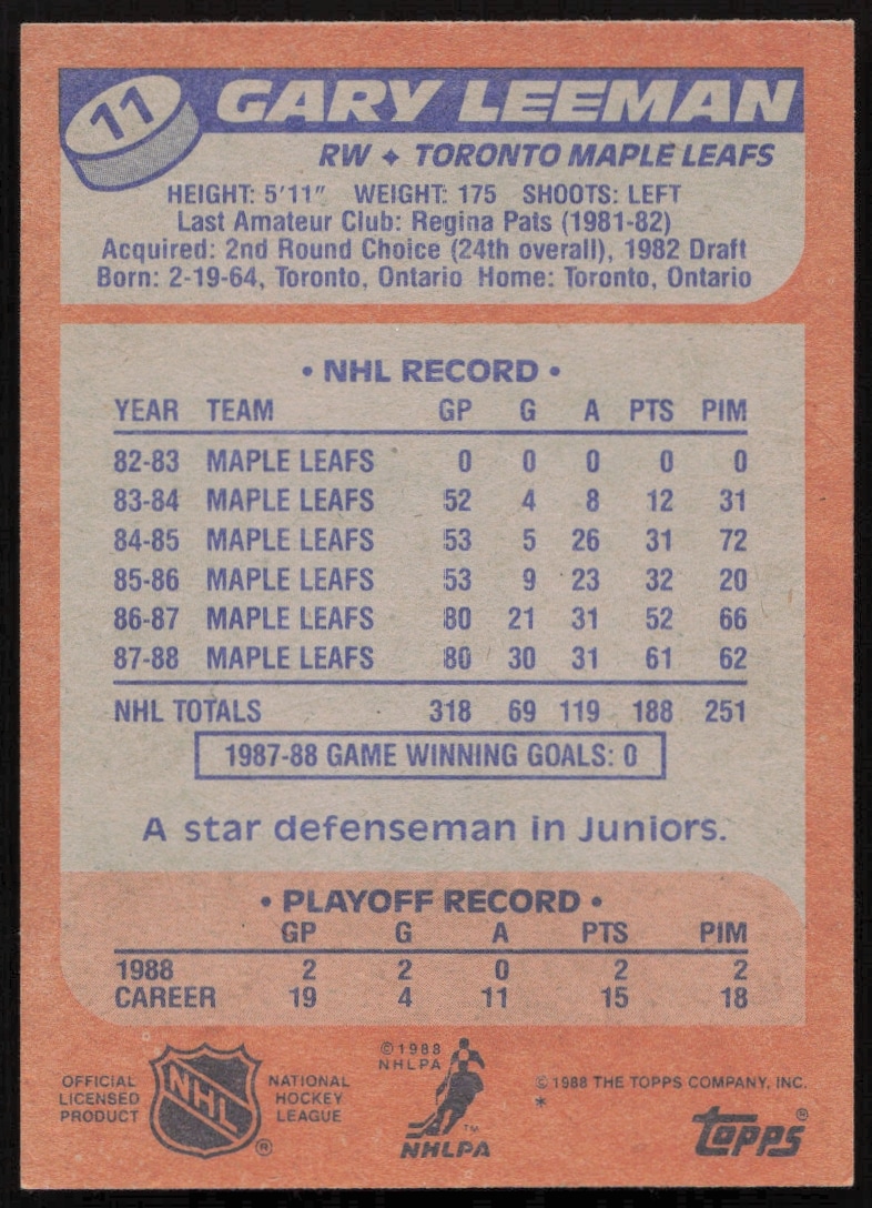 This Hockey card, from 1988-89 is part of the Topps card set. Gary Leeman is featured and has a card number of 11.