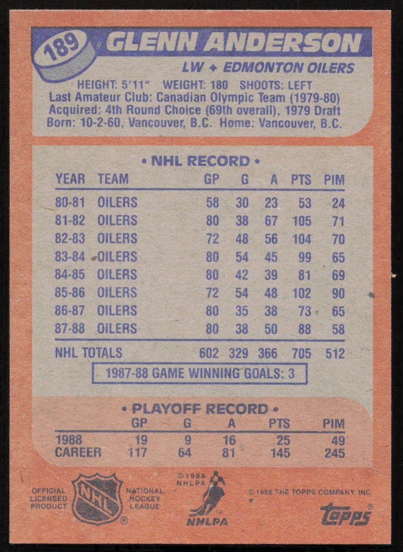 This Hockey card, from 1988-89 is part of the Topps card set. Glenn Anderson is featured and has a card number of 189.