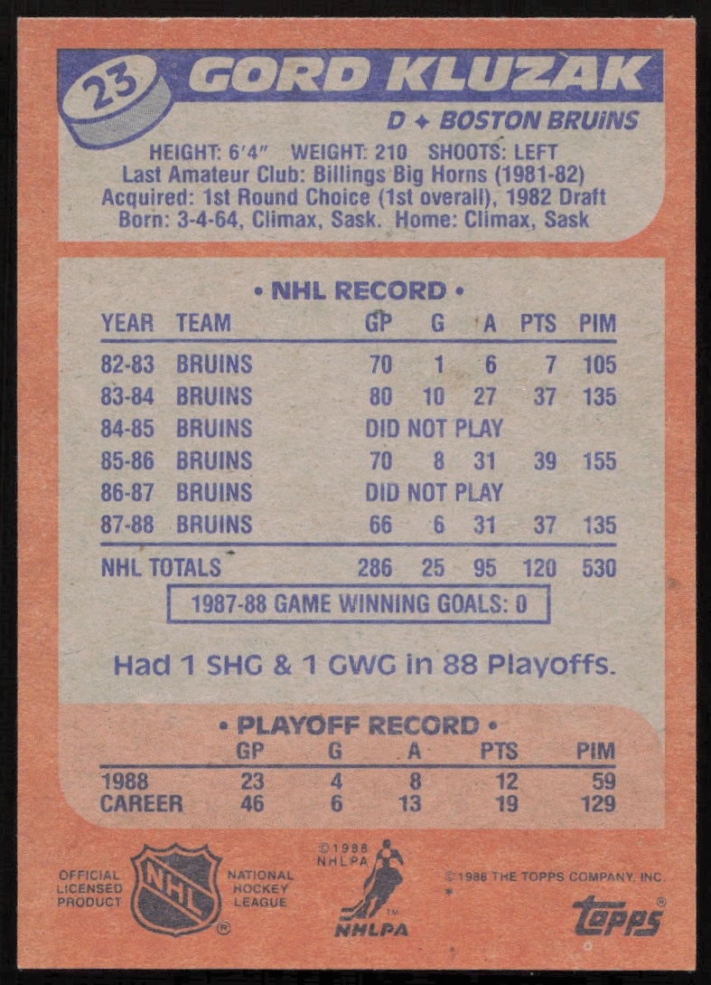 This Hockey card, from 1988-89 is part of the Topps card set. Gord Kluzak is featured and has a card number of 23.