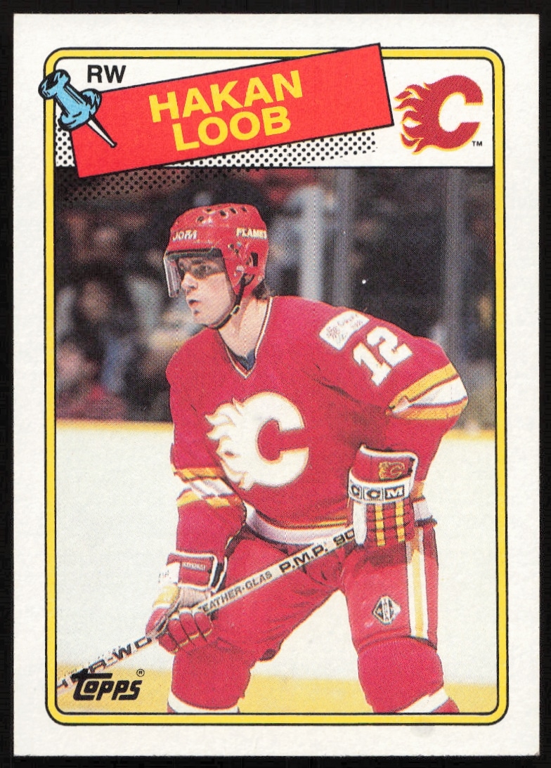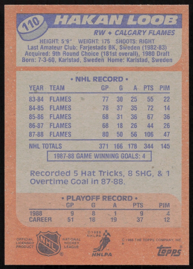 This Hockey card, from 1988-89 is part of the Topps card set. Hakan Loob is featured and has a card number of 110.