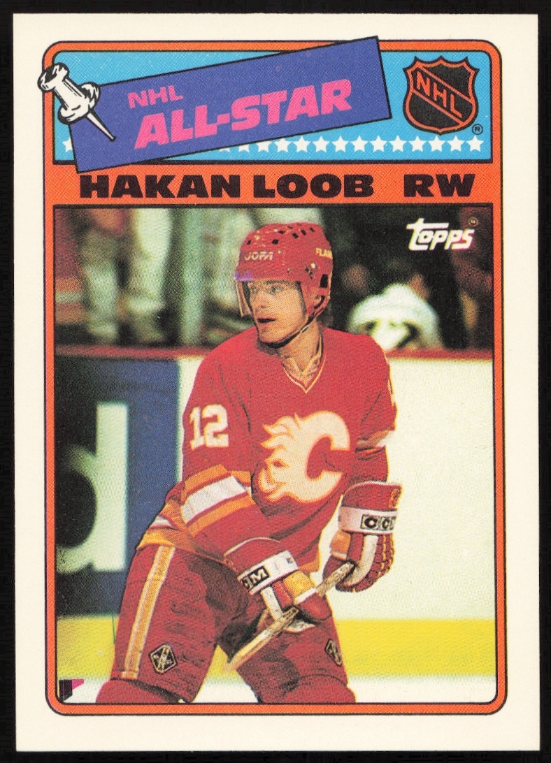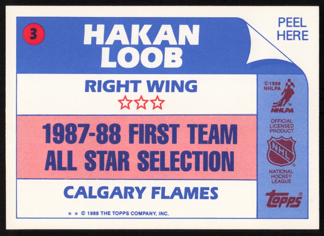 This Hockey card, from 1988-89 is part of the Topps card set. Hakan Loob is featured and has a card number of 3.