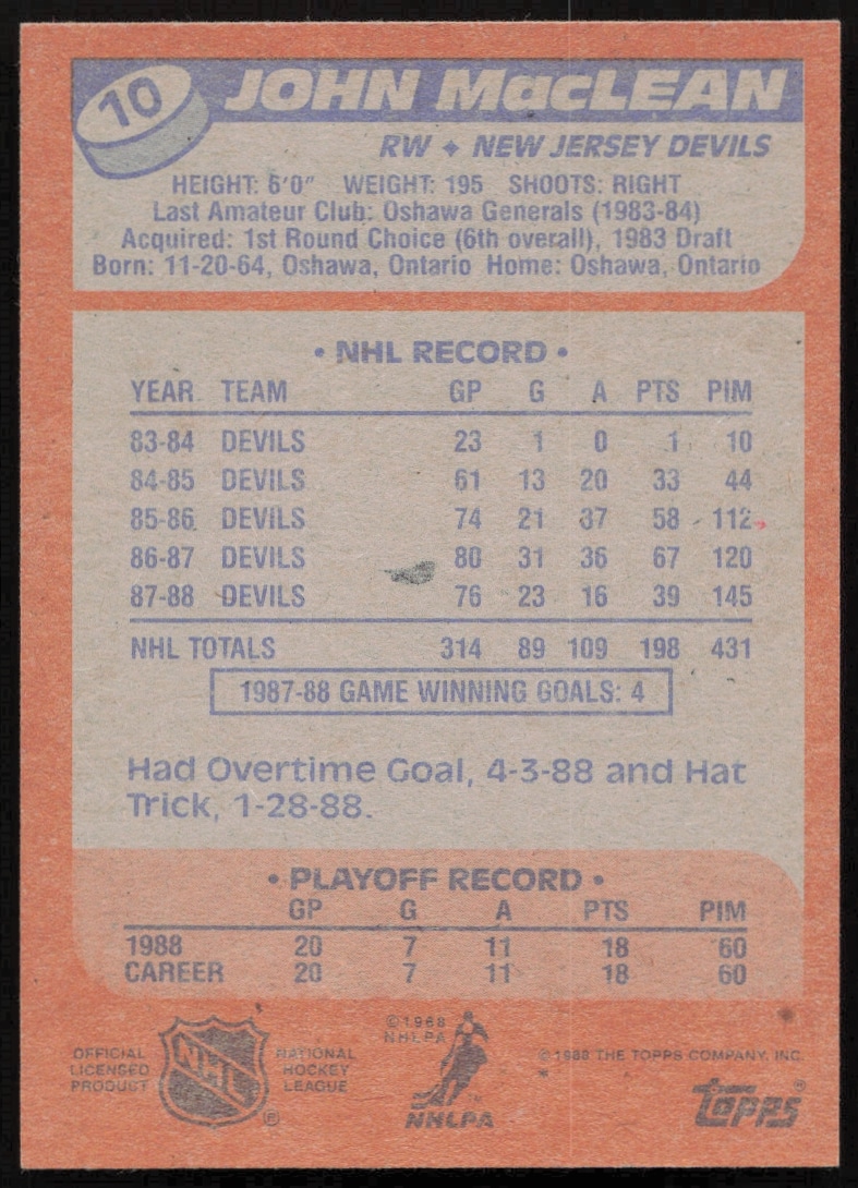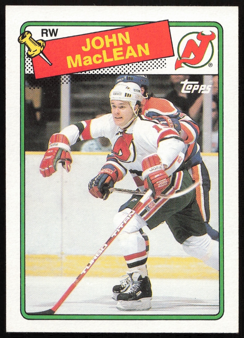 This Hockey card, from 1988-89 is part of the Topps card set. John MacLean is featured and has a card number of 10.