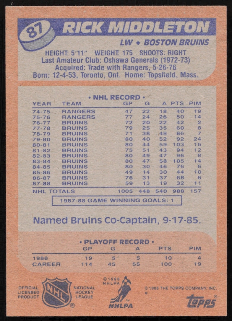 This Hockey card, from 1988-89 is part of the Topps card set. Rick Middleton is featured and has a card number of 87.