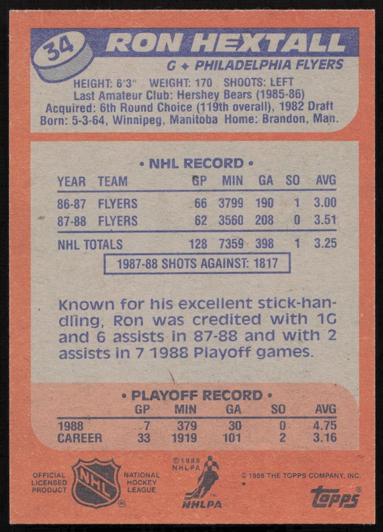 This Hockey card, from 1988-89 is part of the Topps card set. Ron Hextall is featured and has a card number of 34.