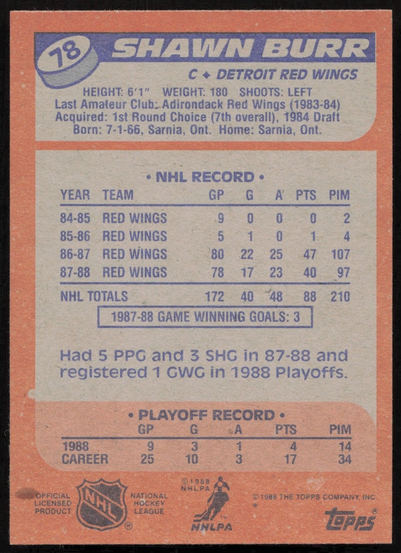 This Hockey card, from 1988-89 is part of the Topps card set. Shawn Burr is featured and has a card number of 78.