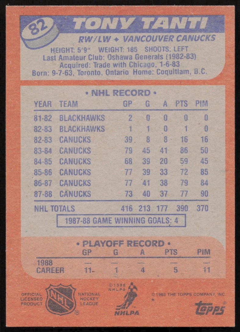 This Hockey card, from 1988-89 is part of the Topps card set. Tony Tanti is featured and has a card number of 82.