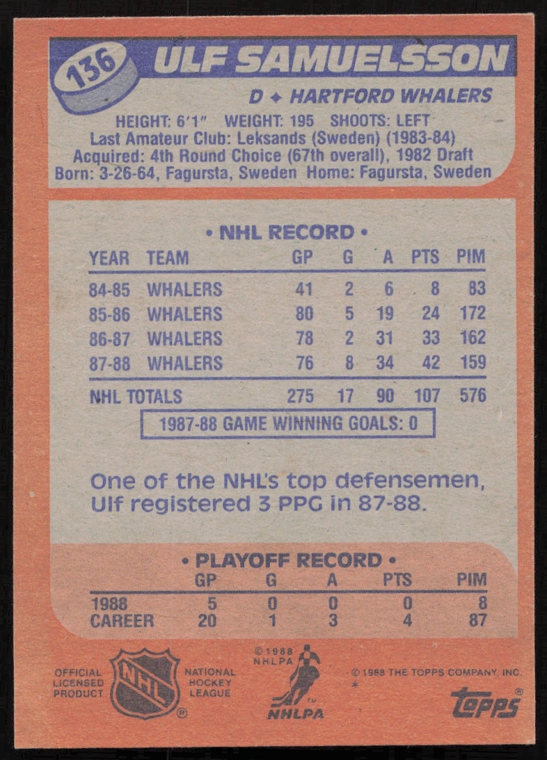 This Hockey card, from 1988-89 is part of the Topps card set. Ulf Samuelsson is featured and has a card number of 136.