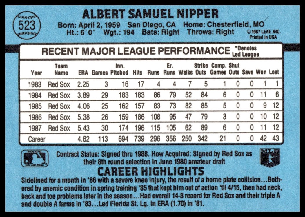 This Baseball card, from 1988 is part of the Donruss  card set. Al Nipper is featured and has a card number of 523.
