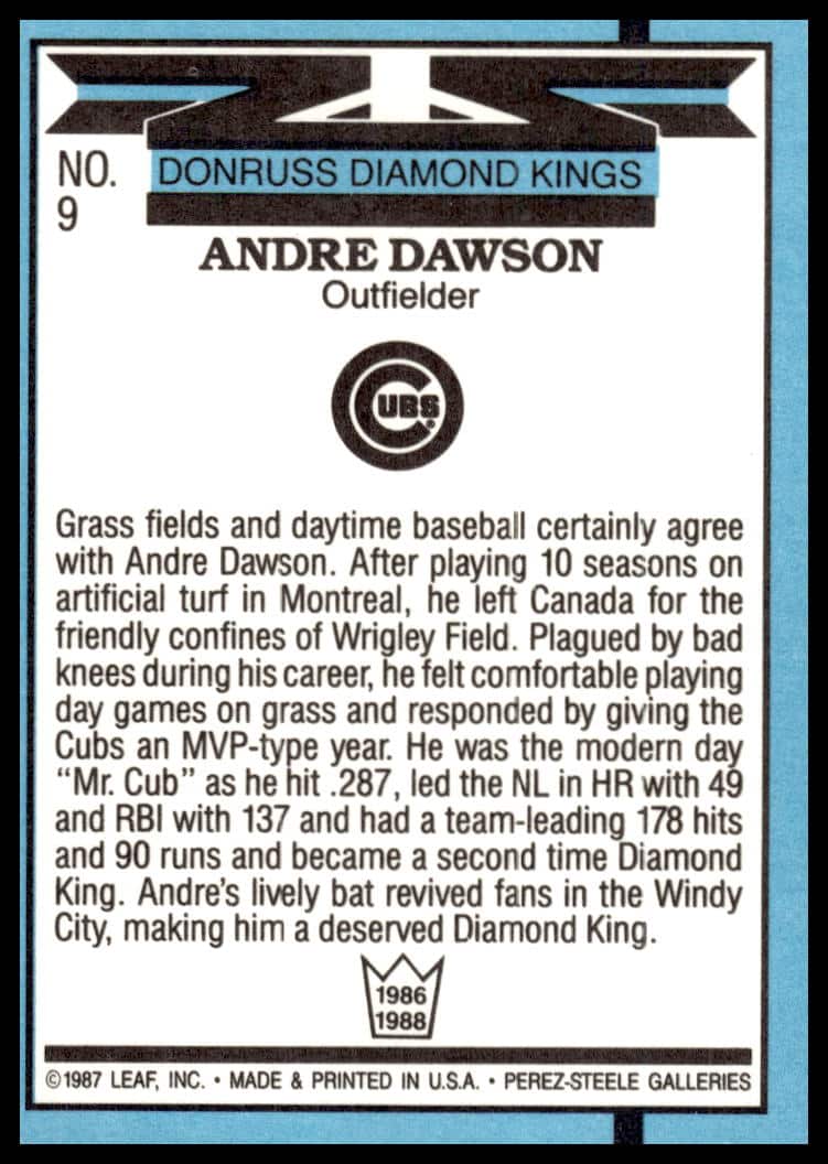 This Baseball card, from 1988 is part of the Donruss  card set. Andre Dawson is featured and has a card number of 9.