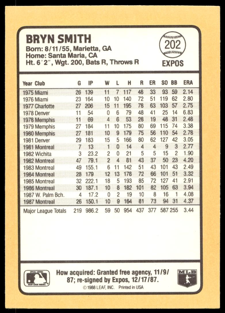This Baseball card, from 1988 is part of the Donruss Baseball’s Best card set. Bryn Smith is featured and has a card number of 202.