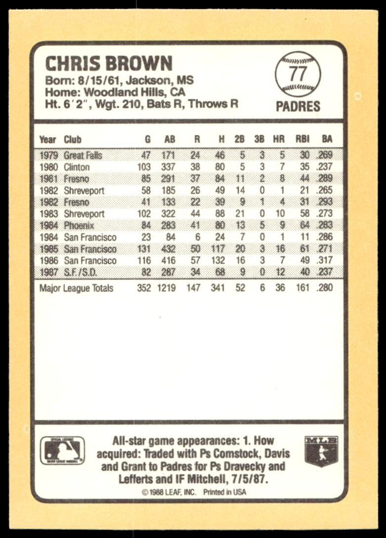 This Baseball card, from 1988 is part of the Donruss Baseball’s Best card set. Chris Brown is featured and has a card number of 77.