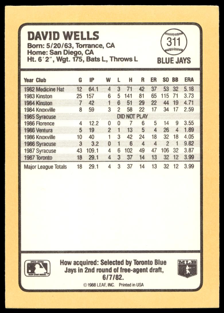 This BaseballΒ card, from 1988 is part of the Donruss Baseball’s BestΒ card set. David Wells is featured and has a card number of 311.