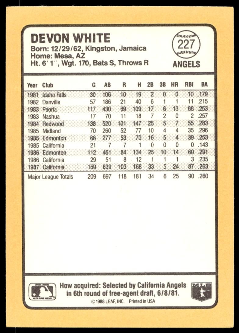 This BaseballΒ card, from 1988 is part of the Donruss Baseball’s BestΒ card set. Devon White is featured and has a card number of 227.
