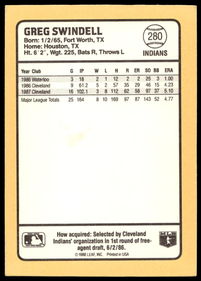 This BaseballΒ card, from 1988 is part of the Donruss Baseball’s BestΒ card set. Greg Swindell is featured and has a card number of 280.