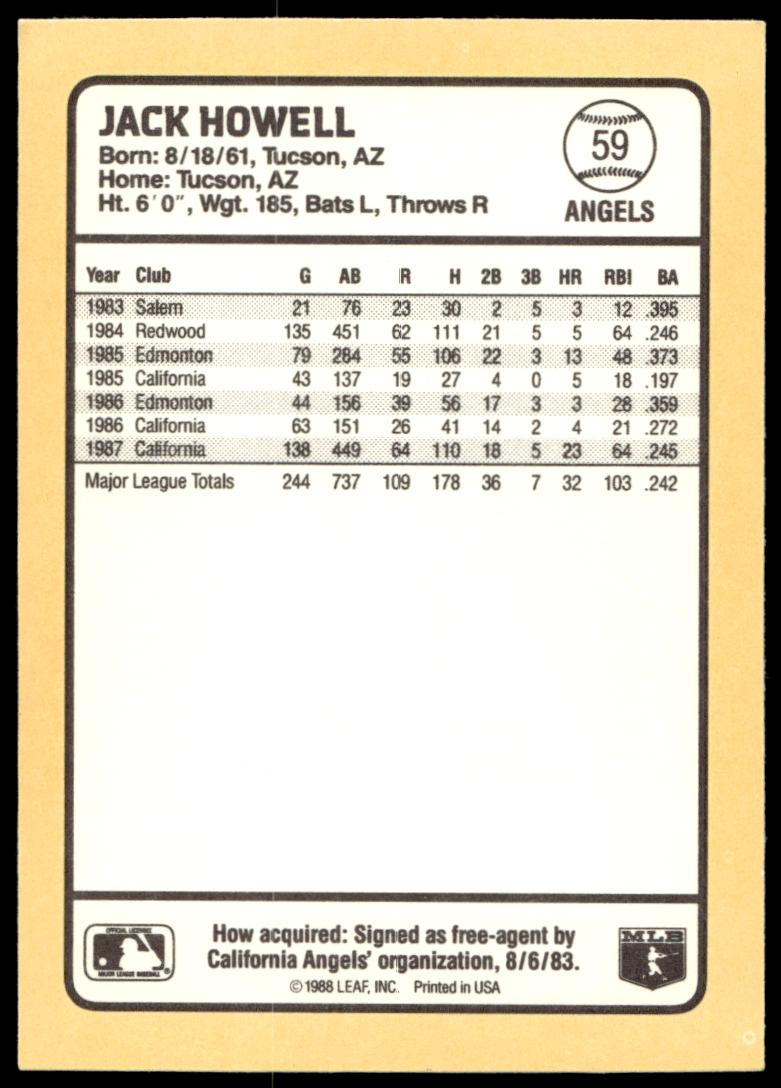 This BaseballΒ card, from 1988 is part of the Donruss Baseball’s BestΒ card set. Jack Howell is featured and has a card number of 59.