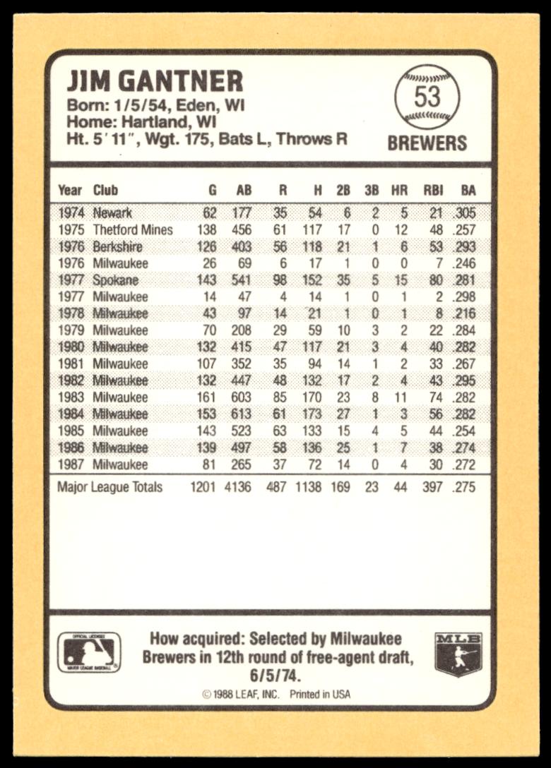 This Baseball card, from 1988 is part of the Donruss Baseball’s Best card set. Jim Gantner is featured and has a card number of 53.