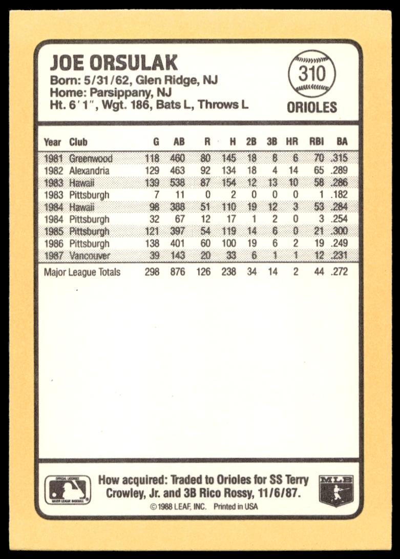 1988 Donruss Baseball’s Best Joe Orsulak #310