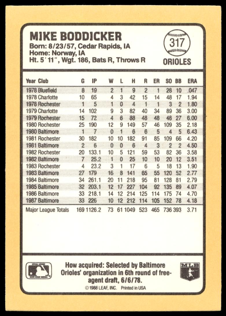 This Baseball card, from 1988 is part of the Donruss Baseball’s Best card set. Mike Boddicker is featured and has a card number of 317.