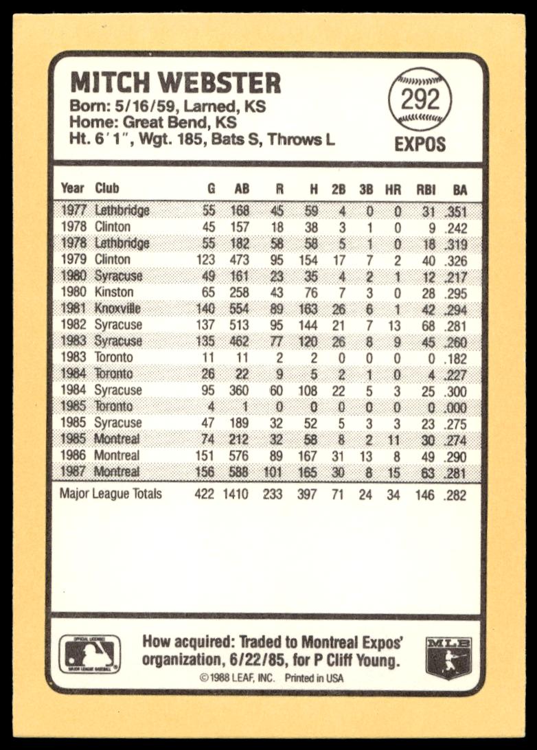 This BaseballΒ card, from 1988 is part of the Donruss Baseball’s BestΒ card set. Mitch Webster is featured and has a card number of 292.