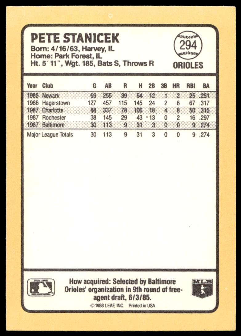 This Baseball card, from 1988 is part of the Donruss Baseball’s Best card set. Pete Stanicek is featured and has a card number of 294.