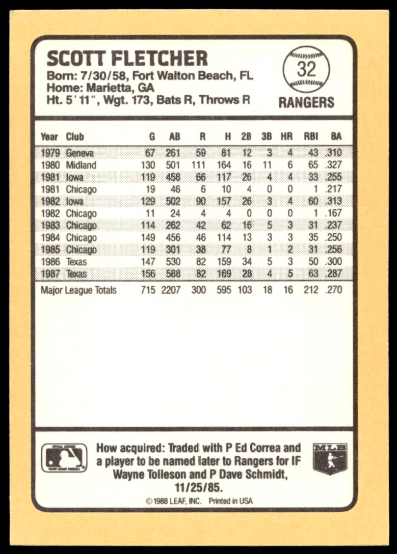 This Baseball card, from 1988 is part of the Donruss Baseball’s Best card set. Scott Fletcher is featured and has a card number of 32.