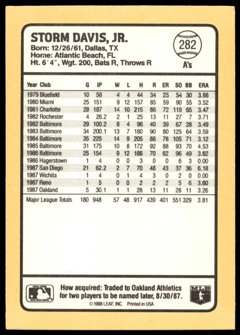 This BaseballΒ card, from 1988 is part of the Donruss Baseball’s BestΒ card set. Storm Davis is featured and has a card number of 282.