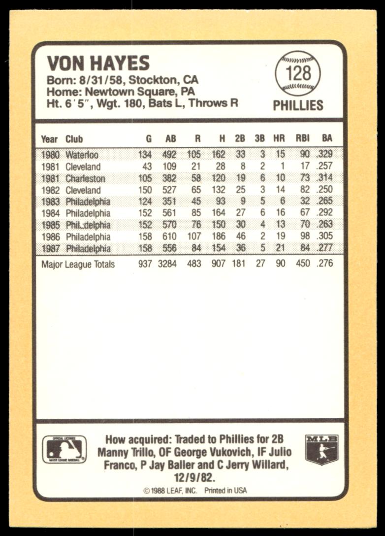 This Baseball card, from 1988 is part of the Donruss Baseball’s Best card set. Von Hayes is featured and has a card number of 128.