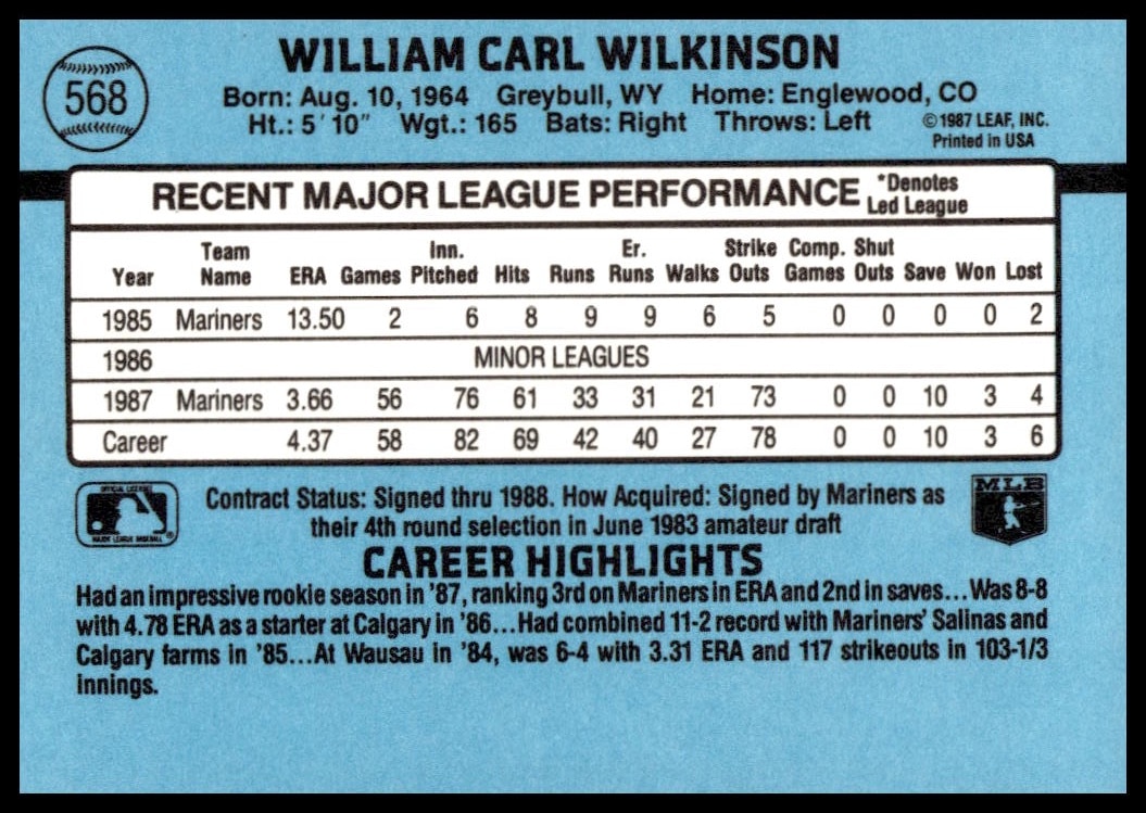 This BaseballΒ card, from 1988 is part of the Donruss Β card set. Bill Wilkinson is featured and has a card number of 568.