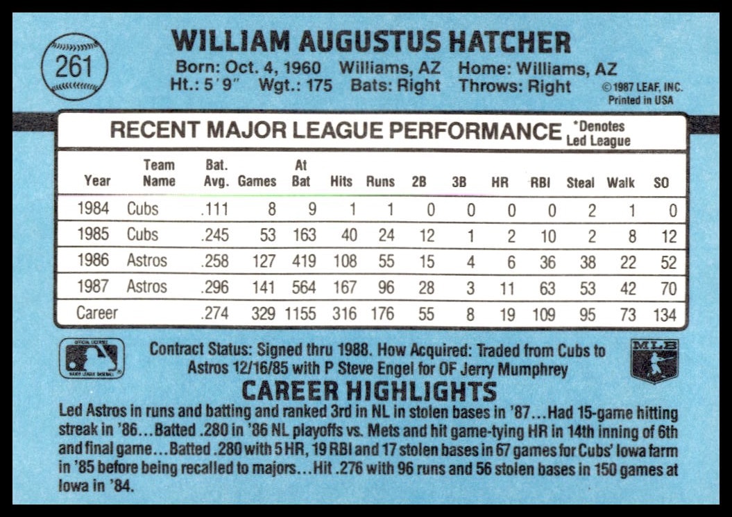 This Baseball card, from 1988 is part of the Donruss  card set. Billy Hatcher is featured and has a card number of 261.