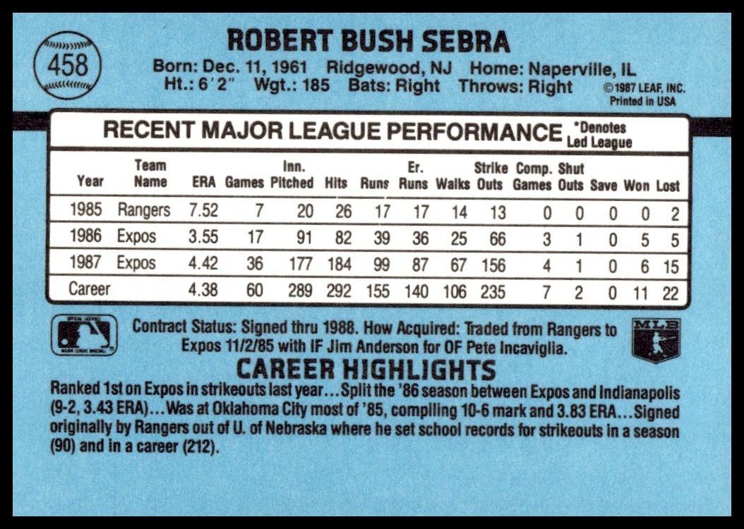 This Baseball card, from 1988 is part of the Donruss  card set. Bob Sebra is featured and has a card number of 458.