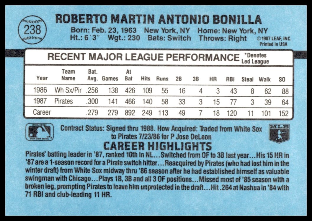 This Baseball card, from 1988 is part of the Donruss  card set. Bobby Bonilla is featured and has a card number of 238.