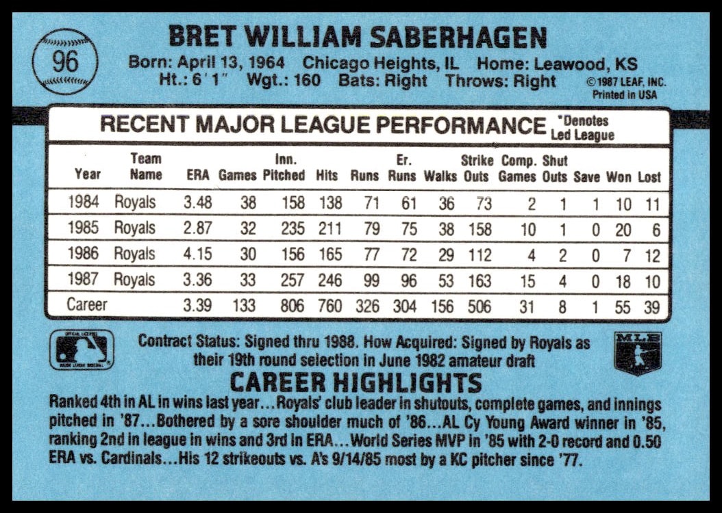 This Baseball card, from 1988 is part of the Donruss  card set. Bret Saberhagen is featured and has a card number of 96.