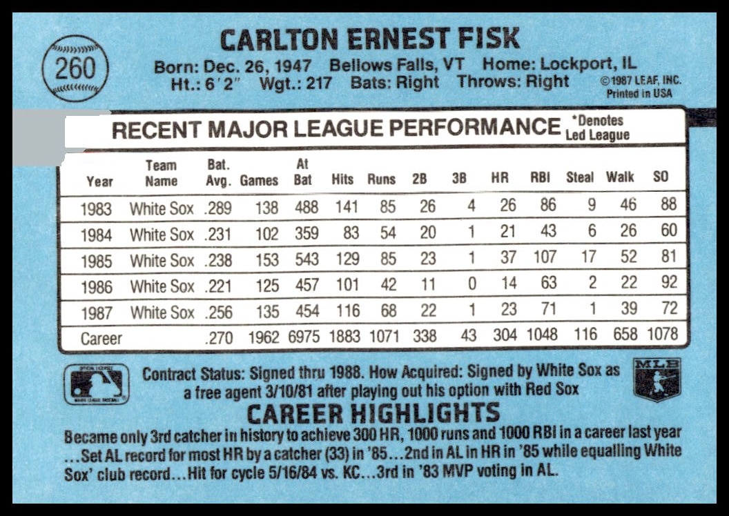 This Baseball card, from 1988 is part of the Donruss  card set. Carlton Fisk is featured and has a card number of 260.