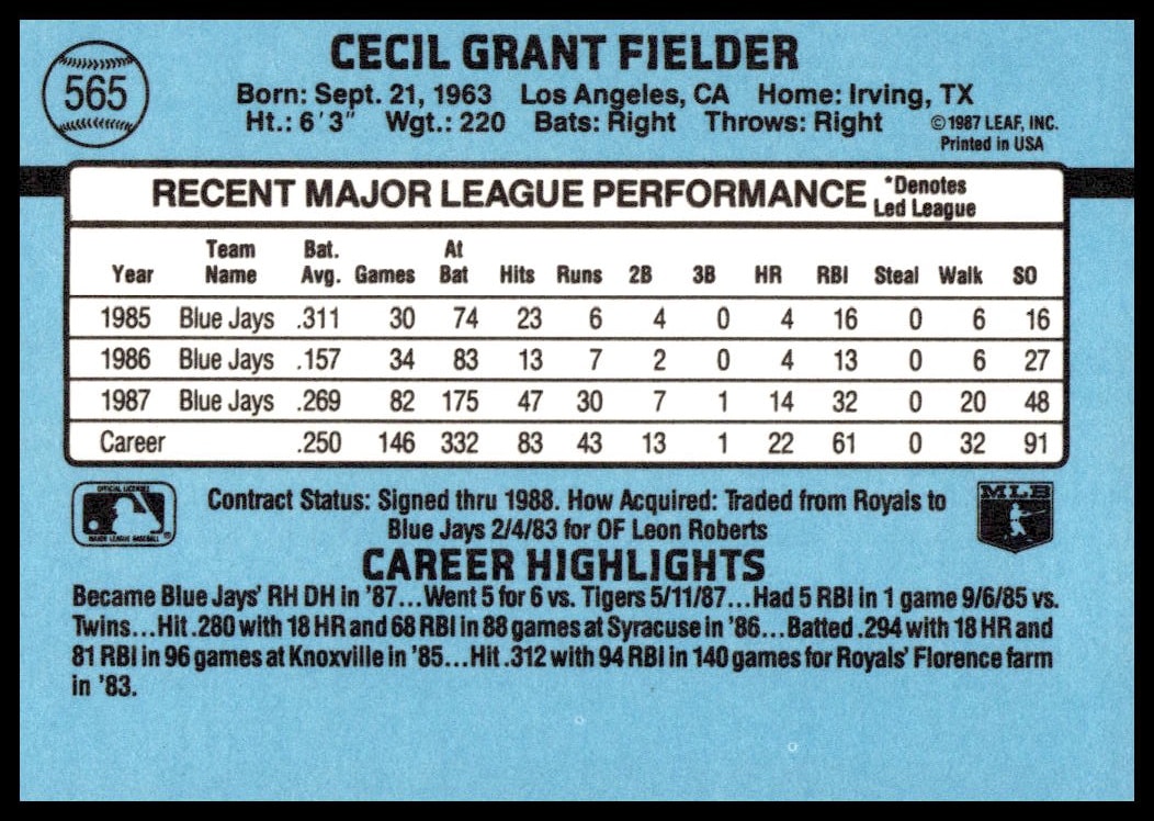 This Baseball card, from 1988 is part of the Donruss  card set. Cecil Fielder is featured and has a card number of 565.